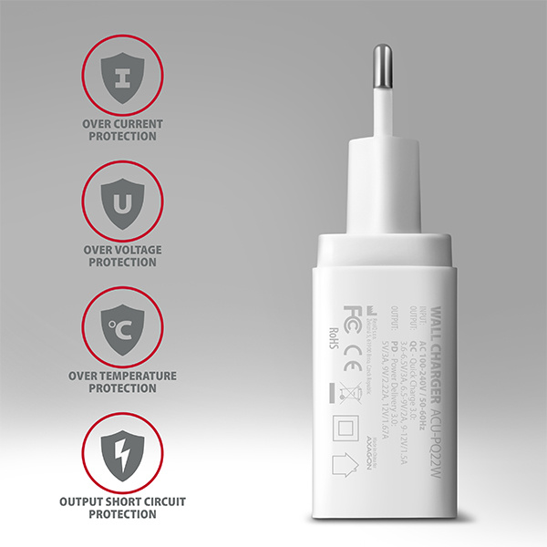 Pokročilý systém ochran na výstupu nabíjecího adaptéru chrání nabíjené zařízení před poškozením.