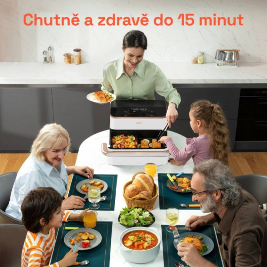 Chytrá horkovzdušná fritéza Cosori TwinFry přináší maximální objem varného prostoru pro početné rodiny nebo setkání a je doslova nadupaná funkcemi, které vám vaření maximální urychlí a usnadní. 10 litrový koš poslouží k přípravě velkých kusů masa, celé drůbeže, jehněčího hřbetu nebo mega porce hranolek. Opravdovým trumfem je možnost rozdělení koše přepážkou na dva 5 litrové a tak si můžete připravit hlavní jídlo a přílohu odděleně. S funkcí Sync navíc fritéza sladí přípravu obou tak, že vaření bude dokončeno ve stejný čas a vy budete mít své jídlo perfektní, čerstvé a chutné. Fritéza obsahuje 4 topná tělesa o celkovém výkonu 2800 W. Díky hornímu i spodnímu ohřevu odpadá nutnost protřepávání jídla během přípravy a také nutnost fritézu předehřát. Maximální teplota se zvýšila na 240 °C, takže fritéza zvládne i grilování. Jídlo můžete připravovat mnohem zdravěji, než s klasickými způsoby vaření jako je fritování v oleji. Například hranolky připravíte s jen jednou lžící oleje. Ve srovnání s pečením v troubě fritéza vyhřívá mnohem menší prostor, a tak spotřebuje pouze zlomek elektrické energie. Cosori TwinFry nabídne 6 univerzálních programů, které vám pokryjí všechny klasické způsoby přípravy jídla. Od pečení masa nebo zeleniny, sladké a slané pečení, grilování, fritování nebo přípravy zmražených jídel. Fritéza je navíc chytrá, a tak ji můžete ovládat vzdáleně přes aplikaci a mít přehled, kdy bude hotovo, zatímco vy potřebujete dokončit práci nebo se pobavit s dětmi. Fritéza prakticky zabírá jen plochu koše, a tak se hodí do všech kuchyní. Koš fritézy se snadno čistí a je možné jej mýt v myčce nádobí. V balení naleznete praktické kleště na bezpečnou manipulaci s jídlem.