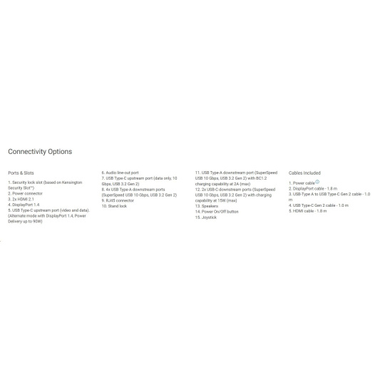 | 1. Security lock slot (based on Kensington Security Slot™) 2. Power connector 3. 2x HDMI 2.1 4. DisplayPort 1.4 5. USB Type-C upstream port (video and data). (Alternate mode with DisplayPort 1.4, Power Delivery up to 90W) 6. Audio line-out port 7. USB Type-C upstream port (data only, 10 Gbps, USB 3.2 Gen 2) 8. 4x USB Type-A downstream ports (SuperSpeed USB 10 Gbps, USB 3.2 Gen 2) 9. RJ45 connector 10. Stand lock 11. USB Type-A downstream port (SuperSpeed USB 10 Gbps, USB 3.2 Gen 2) with BC1.2 charging capability at 2A (max) 12. 2x USB-C downstream ports (SuperSpeed USB 10 Gbps, USB 3.2 Gen 2) with charging capability at 15W (max) 13. Speakers 14. Power On/Off button 15. Joystick |