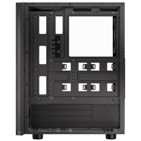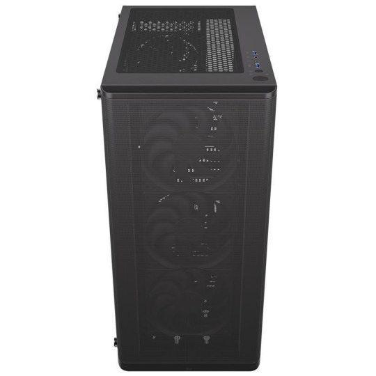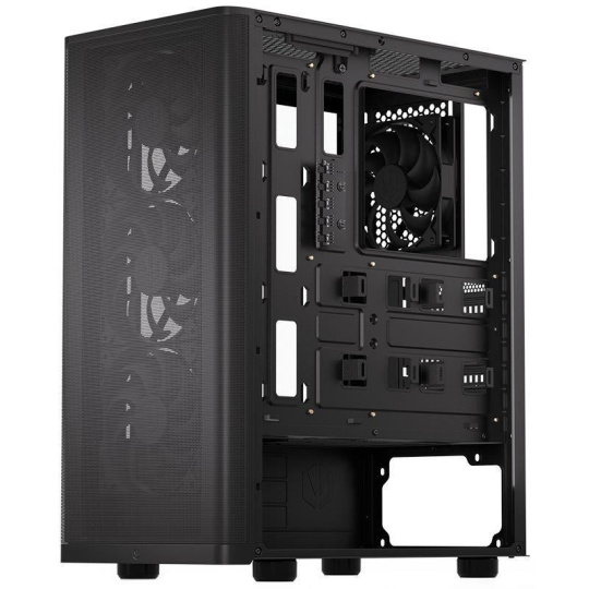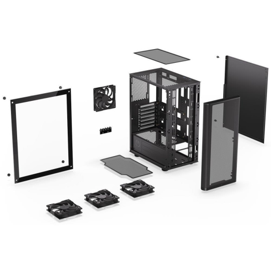 Skříň formátu Middle Tower s průhlednou bočnicí z tvrzeného skla nabízí dvě 2,5" pozice pro SSD disky a jednu 3,5" pozici pro pevný disk. Na horní části se nachází dva USB 3.0 porty, sluchátkový výstup a audio vstup pro mikrofon. Vybavena je čtyřmi 120 mm ventilátory, které spolu s perforovaným čelním panelem zajišťují dostatečné proudění vzduchu. Důmyslné řešení umožňuje pohodlné umístění až 360 mm dlouhého výměníku vodního chlazení na přední straně. Ve skříni je dostatek prostoru pro chladič CPU do výšky až 161 mm a grafickou kartu o délce až 315 mm. Dodávána je bez zdroje. Součástí je také sada prachových filtrů.