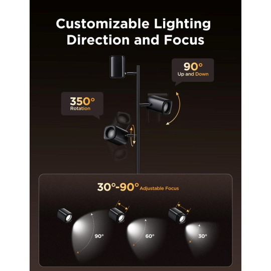 Každé rameno lampy je plně nastavitelné, což vám umožní najít dokonalý úhel a směr světla. Ramena se otáčejí o 350° horizontálně a 90° vertikálně, zatímco hlavice nabízí jemnou rotaci 30°–90°. Tím dosáhnete přesného nasvícení prostoru podle vašich potřeb. Flexibilní ovládání každého zdroje samostatně vám dává kontrolu nad jasem, barvou i zapnutím. Díky této variabilitě je lampa skvělá jak pro čtení, tak pro zvýraznění designových prvků v interiéru.