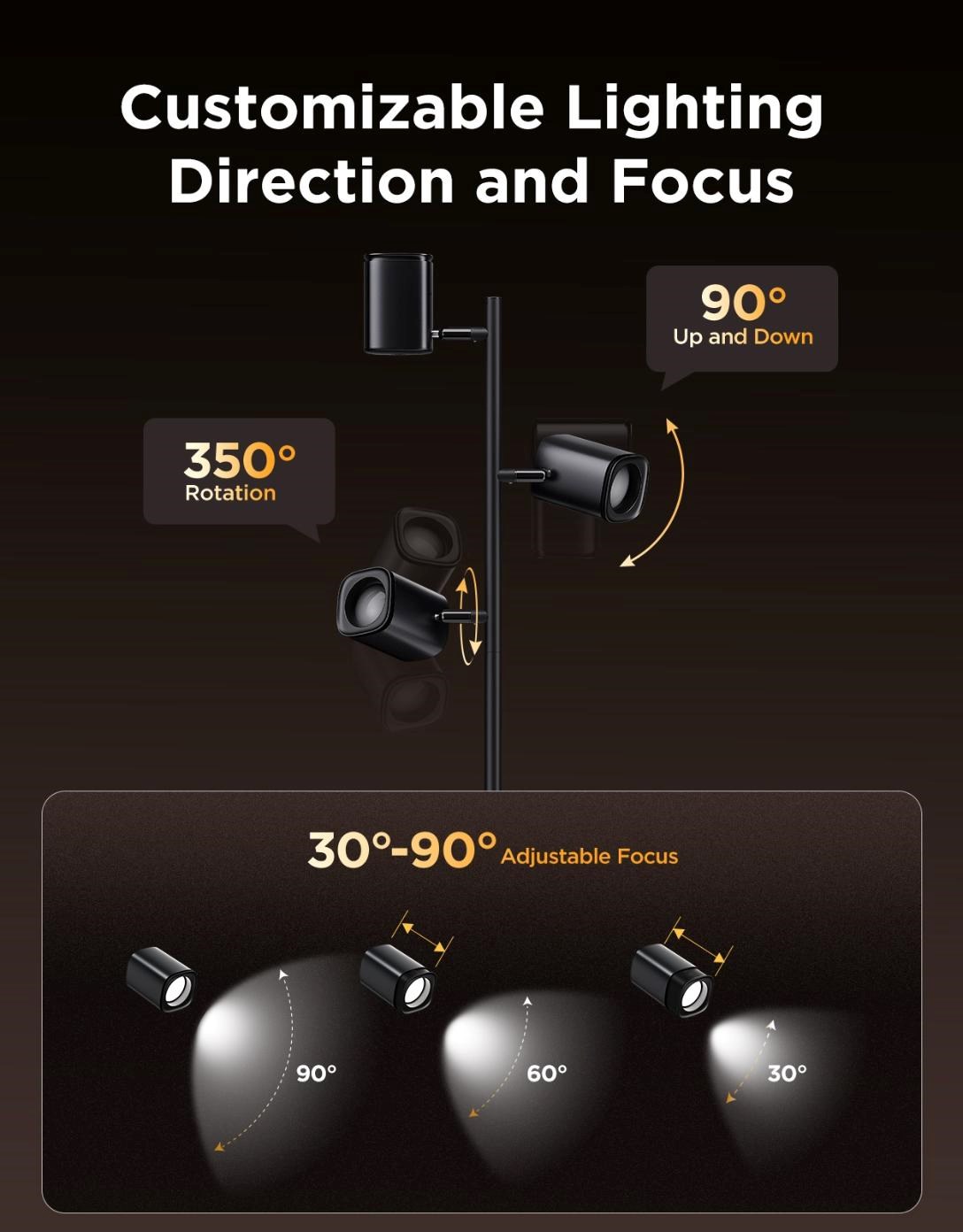 Každé rameno lampy je plně nastavitelné, což vám umožní najít dokonalý úhel a směr světla. Ramena se otáčejí o 350° horizontálně a 90° vertikálně, zatímco hlavice nabízí jemnou rotaci 30°–90°. Tím dosáhnete přesného nasvícení prostoru podle vašich potřeb. Flexibilní ovládání každého zdroje samostatně vám dává kontrolu nad jasem, barvou i zapnutím. Díky této variabilitě je lampa skvělá jak pro čtení, tak pro zvýraznění designových prvků v interiéru.