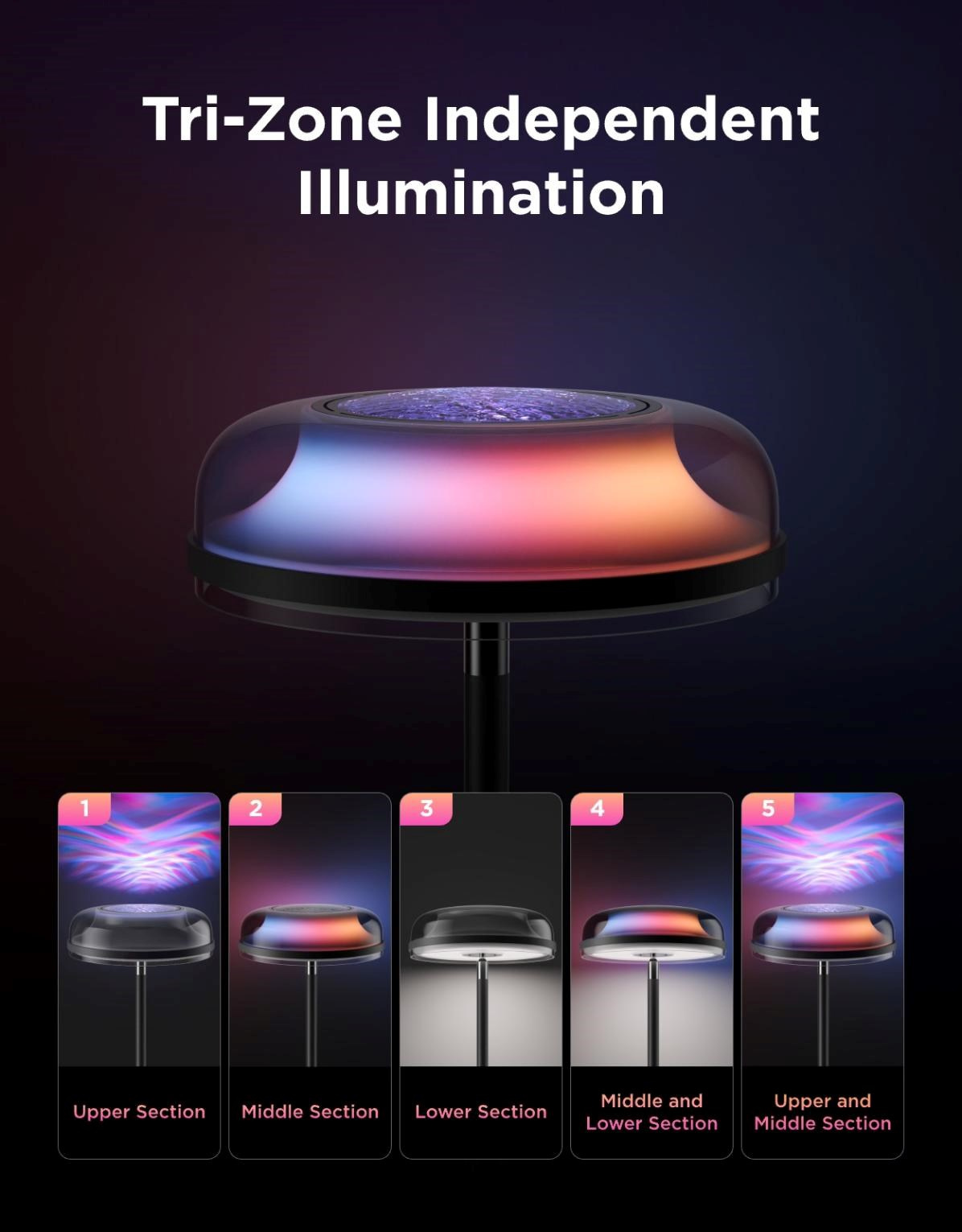 Trojité zónové osvětlení umožňuje individuálně nastavovat spodní, střední a horní část lampy podle vašich potřeb. Spodní LED poskytuje praktické každodenní světlo, střední zóna jemně osvětluje prostor a horní projekční efekt přidává dramatický vizuální zážitek. Díky tomuto systému můžete vždy vytvořit dokonalou atmosféru pro každou příležitost.