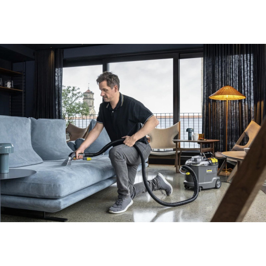 Robustní, odolný, účinný: Sprejový extrakční čistič Puzzi 8/1 působivě čistí čalounění a odstraňuje skvrny z textilních povrchů s vynikajícími a hygienickými výsledky čištění a vysokou účinností. Kompaktní sprejový extrakční stroj nastříká čisticí roztok hluboko do textilních vláken a poté jej opět odstraní s uvolněnými nečistotami. Tento vynikající výkon zpětného sání také zajišťuje rychlé schnutí a znamená, že textilní povrchy lze rychle znovu použít – ideální pro vysoké nároky profesionálů v oblasti úklidu v hotelovém a pohostinském sektoru nebo při čištění interiérů vozidel. Lze použít i standardní extra krátkou hubici na čalounění pro pohodlné a ergonomické čištění úzkých prostor. Díky velmi nízké hmotnosti a ergonomické rukojeti lze sprejový extrakční čistič snadno přenášet jednou rukou. Pohodlí pro uživatele zvyšují také velká tlačítka, která lze ovládat rukou nebo nohou. Víko přístroje a ruční tryska jsou průhledné pro lepší výhled na špinavou vodu.