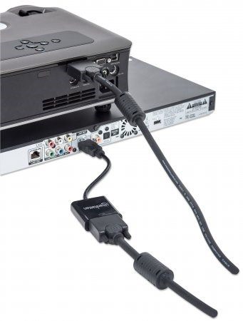 The Manhattan HDMI to VGA Converter helps establish a fast, simple and convenient link between newer HDMI-equipped desktop and notebook computers and other media sources with existing VGA monitors, projectors and other display devices. The Manhattan HDMI to VGA Converter is easy and quick to install and requires no complicated configuration or setup to help extend the service life and fully realize the investment and value of legacy VGA displays, projectors and other equipment. This low-power, cost-effective and reliable solution allows users to transition to HDMI bandwidths, resolutions, Deep Color and more without the expense of upgrading to newer and costly monitors and projectors. Its integrated, all-in-one design helps achieve a compact, integrated solution that eliminates unnecessary cables, tangles and clutter to keep installations and work spaces neat and orderly. Its Micro-USB port allows for additional power if required.