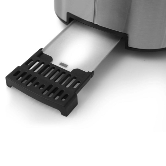 Výsuvná miska na drobky zajišťuje snadné čištění, zatímco automatické centrování a vysunutí pečiva zaručuje rovnoměrné opečení a pohodlné vyjímání.