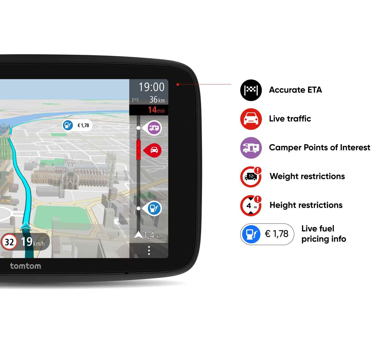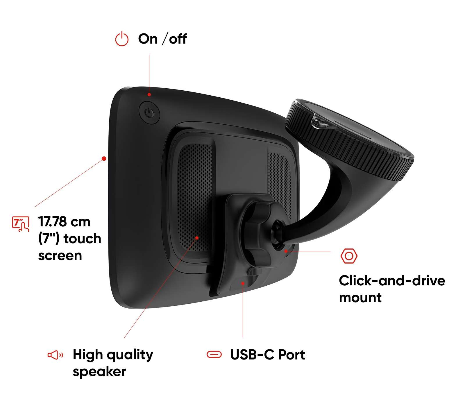Na 7" dotykové obrazovce si můžete prohlédnout svou trasu ve vysokých detailech. A díky ovládání pomocí hlasových příkazů můžete zařízení GO Camper Max ovládat, aniž byste museli sundat ruce z volantu. Snadno použitelný držák Click-and-Drive navíc drží navigační zařízení bezpečně na místě.