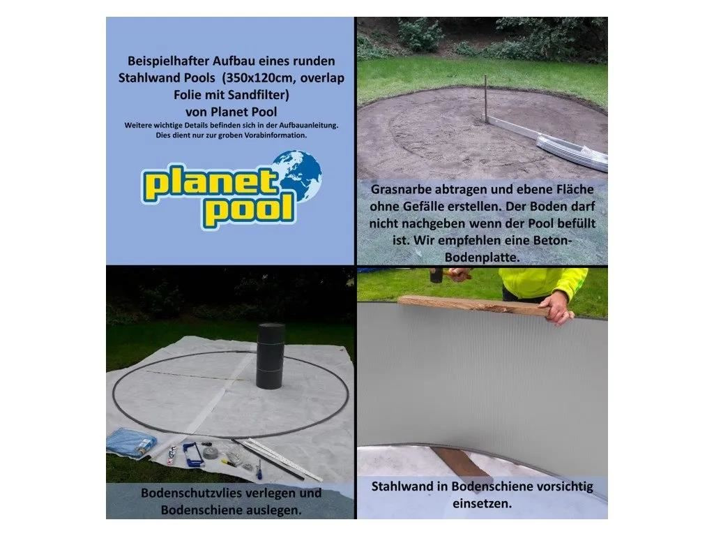 Nadzemní bazény Planet Pool s ocelovou stěnou jsou určeny pro celoroční použití. Odpadá tak potřeba bazén demontovat na podzim a znovu instalovat na jaře jako u sezónních bazénů s nafukovacím límcem či rámovou konstrukcí. Díky žárově pozinkované a nátěrem ošetřené ocelové stěně a mrazuvzdorné fólii je bazén připraven na všechny rozmary přírody. Tento bazén je velmi stabilní, pevný s dlouhou životností. Moderní ANTRACITOVÝ nátěr stěny bazénu + PÍSKOVÁ PVC závěsná folie. Bazén je vhodný pro instalaci na rovném podkladu s dostatečným odstupem od potenciálního spadu nečistot ze stromů a střech. UV stabilizace PVC folie zajišťuje je barevnou stálost a životnost. Tento bazén přestavuje osvědčenou koncepci bazénu a pozitivní historickou zkušenost. Bazén se instaluje pomocí spodních a horních lišt, do kterých se zasazuje ocelová stěna. Oba kraje stěny se propojí pomocí vnitřních a vnějších lišt a šroubů. Mrazuvzdorná folie se pomocí zalomení o horní část ocelové stěny zavěsí a vytvaruje do bazénu dle vizuálních požadavků. Folie je flexibilní a na míru vyrobena pro tento typ bazénu (není třeba žádných úprav). Pro montáž krok za krokem následujte pokyny v montážním návodu. Parametry: Tvar bazénu: kulatý tvar Rozměry bazénu: 350 x 90 cm Ocelová stěna: 0,3 mm UV stabilizovaná PVC fólie, tloušťka 0,2 mm, barva PÍSKOVÁ Barva bazénu: ANTRACITOVÁ Děrování pro standardní vestavěný skimmer a zpětnou trysku k dispozici Horní a podlahová lišta z plastu Bazén odpovídá evropské normě pro bazény EN 16562-2.