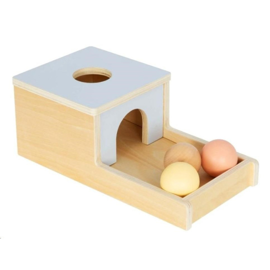 Dřevěný box (bedýnka) s dřevěnými koulemi v přírodních pastelových barvách seznámí miminko s vlastnostmi objektů (předmětů), v tomto případě dřevěných koulí. 3 dřevěné koule v přírodním provedení a v jemných pastelových barvách mizí v dřevěném domečku (boxu), aby se pak dveřmi vykutálely do dřevěné zahrádky (ohrádky). Tuto záhadu musí každé dítko vyřešit a tak bude tuto zábavnou činnost opakovat znovu a znovu. Při opakované hře děti zdokonalují své dovednosti, zabaví se a užijí si spoustu legrace.
