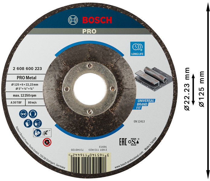 Navržený pro broušení kovu - Kotouč PRO Metal jsme vyrobili pro kovoobráběče, kteří potřebují spolehlivý hrubovací kotouč s dlouhou životností k broušení kovu. Odolný hrubovací kotouč PRO Metal využívá vysoce kvalitní korundová zrna k efektivnímu broušení kovu a oceli. Zrna zkombinovaná s funkčními plnivy a zalitá do matrice z fenolové pryskyřice zajišťují pevnost, odolnost vůči teplu a stabilní výkonnost. Přesně vyrobená síť ze skelných vláken vyztužuje kotouč pro větší bezpečnost. S otvorem 22,23 mm pro standardní úhlové brusky s pojistnou maticí.