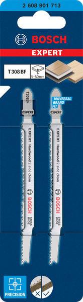 Velmi čistý řez horní i spodní strany - Zajistit, aby na viditelné části obráběného materiálu byla „čistá strana řezu“, bylo mezi truhláři a tesaři vždycky umění. Někdy můžete obrobek otočit, jindy lze držet přímočarou pilu vzhůru nohama. Nebo můžete použít plátek EXPERT Hardwood 2-side clean, který díky protisměrným zubům nabízí perfektní řez bez otřepů na obou stranách. Důmyslná konstrukce těchto pilových plátků pro přímočaré pily znamená, že po řezání již není potřeba žádná další práce – zuby zabraňují otřepu materiálu jak při zdvihu, tak při sestupu pily. To je ideální pro profesionály, kteří chtějí ušetřit čas a zároveň poskytovat svým klientům práci nejvyšší kvality. Vyrobeno z bimetalu – pásku z rychlořezné oceli spojeného s ohebným ocelovým listem s cílem zajistit pevnost i flexibilitu. Pilový plátek Bosch EXPERT Hardwood 2-side clean je dostatečně robustní na řezání kuchyňských desek z laminované dřevotřísky nebo tvrdého dřeva. K dispozici pro rovné řezy bez otřepů (T308BF) a pro obzvláště přesné úhlové řezy bez otřepů (T308BFP). Kompatibilní se všemi pilami s upínáním do T.