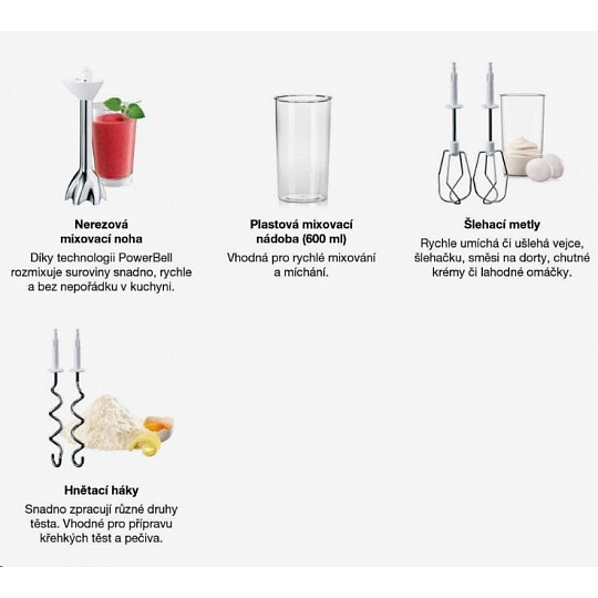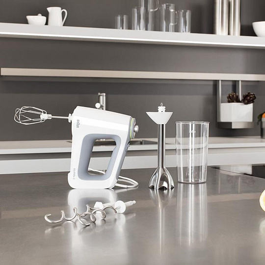 Ruční mixér Braun MultiMix 5 nabízí 750W výkonný motor a 9 rychlostí pro snadné a rychlé šlehání, hnětení a mixování. Vybrané modely současně nabízí také mixovací nohu s plastovou mixovací nádobou a sekací nástavec, takže se MultiMix 5 stává šlehačem, tyčovým mixérem a sekáčkem v jednom. Technologie SmartMix a unikátní umístění motoru přímo nad příslušenství přenáší váhu přímo do mísy, nikoliv do vaší ruky, takže je šlehání a mixování až o 40 % lehčí. Design mixéru MultiMix je hladký a bez ventilačních otvorů. Díky tomu dovnitř mixéru nepronikají nečistoty a je zajištěna delší životnost produktu. Protiskluzová měkká rukojeť SoftGrip a snadná výměna příslušenství je příjemnou tečkou.