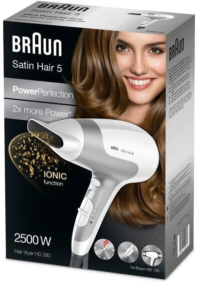 Braun vysoušeč vlasů Satin Hair 5 HD580 je nejvýkonější vysoušeč z řady PowerPerfection a rychlý výsledek bez námahy. S výkonem 2500 wattů je vysoušeč vlasů Satin Hair 5 HD580 ultra silným nástrojem pro každodenní rychlé vysoušení vlasů. Kombinuje optimální teplotu a rychlost proudění vzduchu. Silný neznamená těžký, tento kompaktní a ergonomický vysoušeč umožňuje manipulaci bez námahy a s lehkostí.