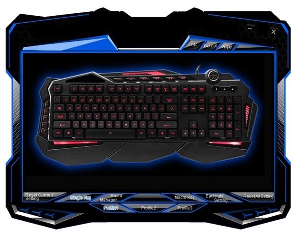 3 profily - na klávesnici naleznete klávesy pro přepínání mezi 3 nezávislými profily. Pro každý profil lze individuelně nastavit barva podsvícení, její intenzita, makra, předefinované klávesy...
