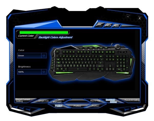 7 barev podsvícení - na klávesnici lze zvolit celkem 7 barev podsvícení. K jejich volbě můžete použít herní software, nebo speciální tlačítko klávesnice. Na výběr je z těchto barev: modrá, červená, zelená, cyan, bílá, žlutá a fialová. Jak v herním software tak opět i na klávesnici lze i nastavit intenzitu podsvícení.
