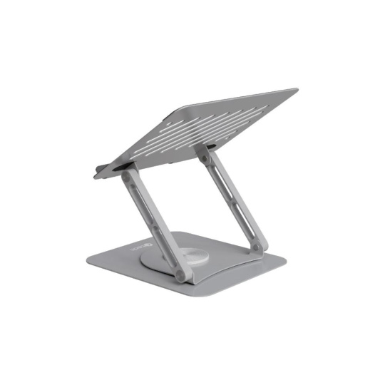Quallis NTS-200 podporuje notebooky až do velikosti 16" a jeho pevná hliníková konstrukce zajišťuje vysokou odolnost, nosnost a elegantní vzhled. Na rozdíl od běžných stojanů je vybaven otočnou základnou s 360° rotací, což umožňuje plynulé natáčení notebooku bez nutnosti přemisťování celé konstrukce – ideální při prezentacích, sdílení obrazovky nebo střídavé práci více uživatelů.