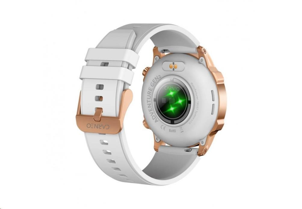 Moderní outdoorové fitness hodinky CARNEO ADVENTURE HR+ druhé generace v zlatorůžové barvě s bílým, na dotek velmi příjemným silikonovým řemínkem a barevným SUPER AMOLED displejem s vysokým jasem a funkcí trvalého zobrazení času monitorují vaši denní aktivitu, úroveň stresu, ale lze je spárovat s mobilním telefonem a upozornit vás na příchozí hovor nebo SMS. Hodinky umožňují telefonovat, aniž byste museli telefon vyndat z tašky, díky vestavěnému mikrofonu a reproduktoru až do vzdálenosti 10 m od telefonu. Jejich bezchybné kovové tělo s nadčasovými outdoorovými křivkami je tak návykové, že je po prvním nošení nebudete chtít sundat ze zápěstí. Extrémně odolné sklo Gorilla glass, ochrání jejich křišťálově čistý displej před poškrábáním.