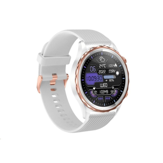 Moderní outdoorové fitness chytré hodinky Carneo Queen HR+ v elegantní bílé barvě se stříbrnou korunkou z nerezové oceli mají kulatý barevný displej SUPER AMOLED chráněný tvrdým minerálním sklíčkem. Umožňují měření srdečního tepu, stresu, BMI, ujeté vzdálenosti, monitorování spálených kalorií či kvality spánku. Obsahují 380mAh baterii s výdrží až 5 dní. Podle certifikace IP67 jsou odolné vůči vodě a prachu. Jsou kompatibilní s operačním systémem iOS a Android. Hodinky mají na dotek příjemný silikonový řemínek v černé barvě, který lze vyměnit za řemínek v jiné barvě či kožený nebo kovový a tím pádem změnit hodinkám sportovní vzhled za manažerský. Vkusný outdoorově-luxusní design se snadno kombinuje k obleku či volnočasovému outfitu. Hodinky i aplikace jsou kompletně v češtině, takže si budete jistě spolu dobře rozumět.