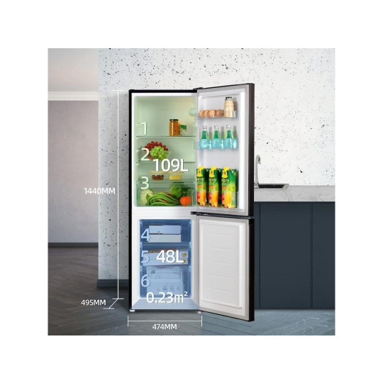 Kombinovaná lednice s mrazákem dole o celkovém objemu 157 litrů.