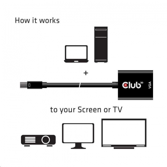 | In the box | Club 3D CAC-2113 MiniDisplayPort™ to VGA Black Active Adapter M/F |