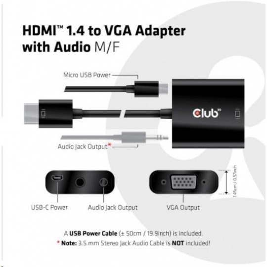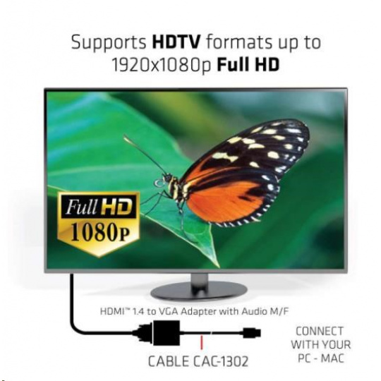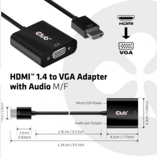 The Club 3D CAC-1302 is an active HDMI™ 1.4 to VGA signal converter. It allows you to convert digital HDMI™ signal into analog VGA signal and extracts audio signal from HDMI™ signal through the R/L audio port.