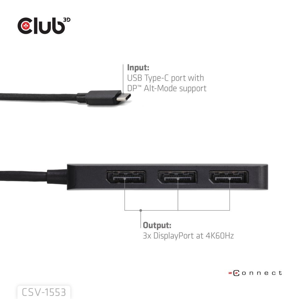 CSV-1553 je rozbočovač MST pro DisplayPort™. Tento rozbočovač USB-C MST je navržen tak, aby vyhovoval vašim nejvšestrannějším požadavkům na připojení, jako je mobilní telefon, tablet, notebook atd. s výstupem USB-C, který podporuje režim DP™ Alt-Mode jako hostitel pro 3 porty DisplayPort s podporou ultra vysokého rozlišení. Podporuje DP2.1 AltMode a umožní vám výstup jednoho displeje s maximální kapacitou jednoho 8K30Hz nebo dvou displejů s podporou 8K30Hz + 4K144Hz nebo trojitých displejů, každý s frekvencí 4K60Hz. Podporuje všechna zařízení kompatibilní s rozhraním USB-C nebo Thunderbolt4 s podporou alternativního režimu DisplayPort.