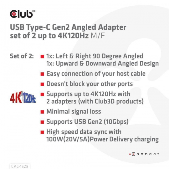 The Club 3D CAC-1528 USB Type-C Gen2 Angled Adapter set of 2 up to 4K120Hz M/F is a versatile set of angled connector adapters providing cable management solutions. With either- or both- conector adapters you can avoid blocking other ports on your host device. Also for displays with a USB Type-C input this can be an easy fix for not blocking other ports and/or bending cables. This set contains 1 of each adapters and are universal in their usage, Data, Video and Power Delivery up to 100W(20V/5A). The adapters are verified with Club 3D products to support up to 4K120Hz. Supports USB Gen2 up to 10Gbps of data speed.