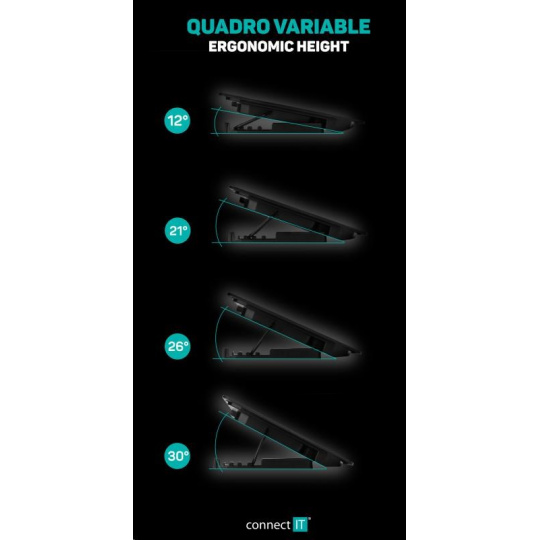 Chladicí podložka pod notebook CONNECT IT "FrostBreeze" CCP-1910-BK, která vybavená dvěma ventilátory s modrým LED podsvícením, celokovovou chladící mřížkou a výškovým čtyřstupňovým polohováním. Kompatibilní s notebooky do 15,6".