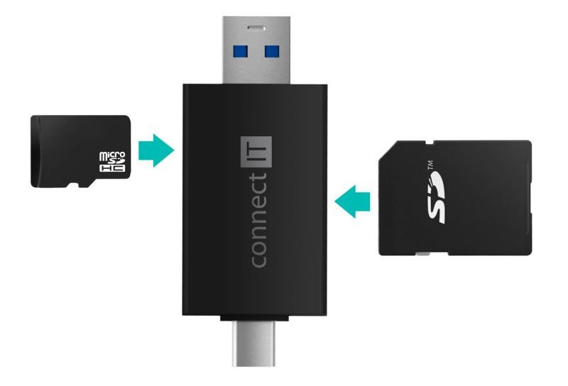 Praktická externí čtečka paměťových karet s konektory USB-A 3.0 a USB-C Dual Gear umožňuje kdekoliv přenášet obsah mezi vašimi paměťovými kartami a počítačem. Používá (zpětně kompatibilní) vysokorychlostní rozhraní USB 3.0, díky němuž je zajištěn bezproblémový a bleskový přenos dat mezi zařízeními. Čtečka má tvar flashdisku, takže ji lze snadno přepravovat a vzít si ji třeba i na cesty. Potěší i praktické krytky USB konektorů, které zabraňuje vniknutí nečistot a prachu, čímž předchází jakýmkoliv problémům. Přenosová rychlost 5 Gbps