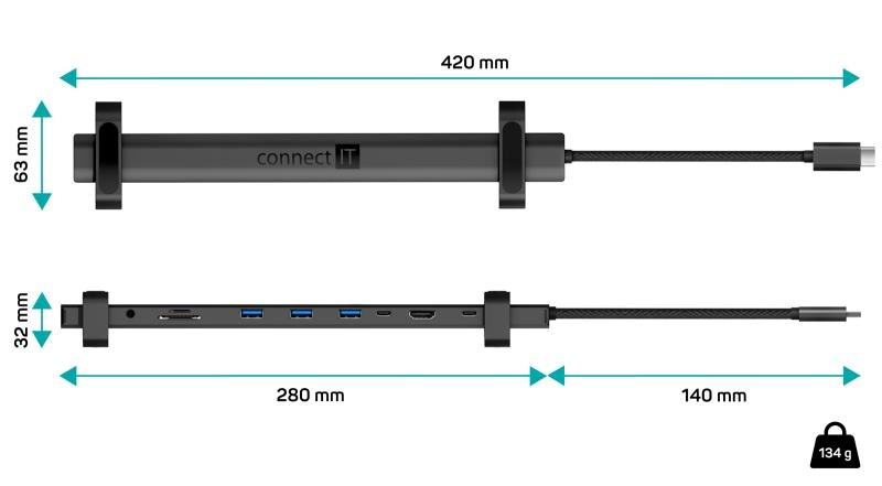 Prakticky tvarovaná USB-C dokovací stanice "Multi10in1" pro připojení až 10 periferií (2x USB-C, 1x HDMI, 3x USB-A, 3.5 mm jack, RJ45 Gigabit Ethernet. SD karta, MicroSD karta).