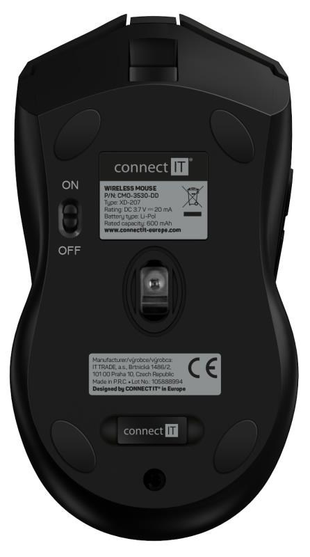 - Přepínač On/Off pro úplné vypnutí myši z důvodu úspory baterie