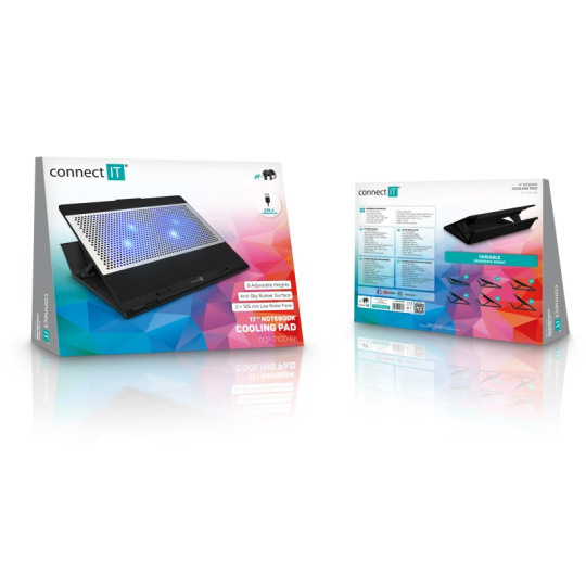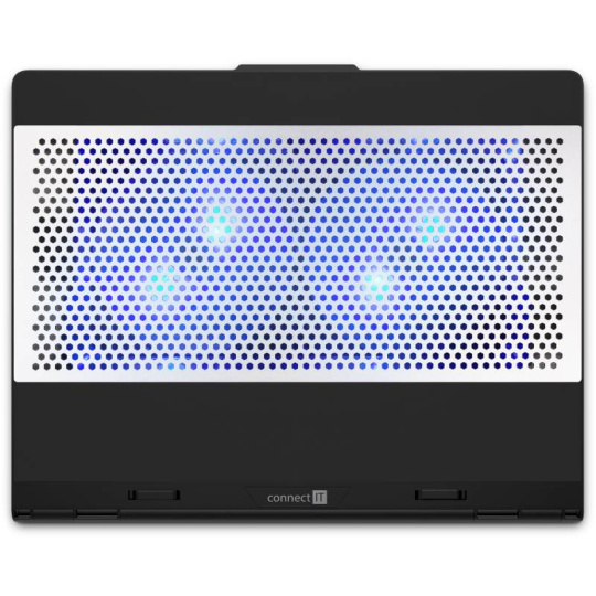Chladicí podložka pod notebook CONNECT IT "FrostCool" CCP-7100-BK, která je vybavená dvěma ventilátory s modrým LED podsvícením, hliníkovou chladící mřížkou a výškovým šestistupňovým polohováním. Kompatibilní s notebooky do 15,6".