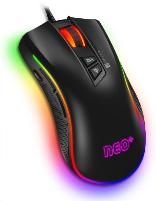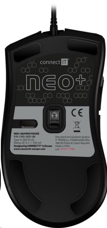 Kromě běžných funkcí je tato myš unikátní nastavitelnou velikostí a to pomocí odnímatelné pravé bočnice. Takto si myš přizpůsobíte svým potřebám. Část myši je pokryta povrchem "honeycomb grip" pro stabilnější a pevnější úchop i při dlouhodobém hraní. K této myši je dodáván arch promo samolepek "CONNECT IT NEO" a software ke stažení zcela zdarma na stránkách www.connectit-europe.com. Samozřejmostí je u této série prémiový oplet přívodního kabelu a pozlacený USB konektor.