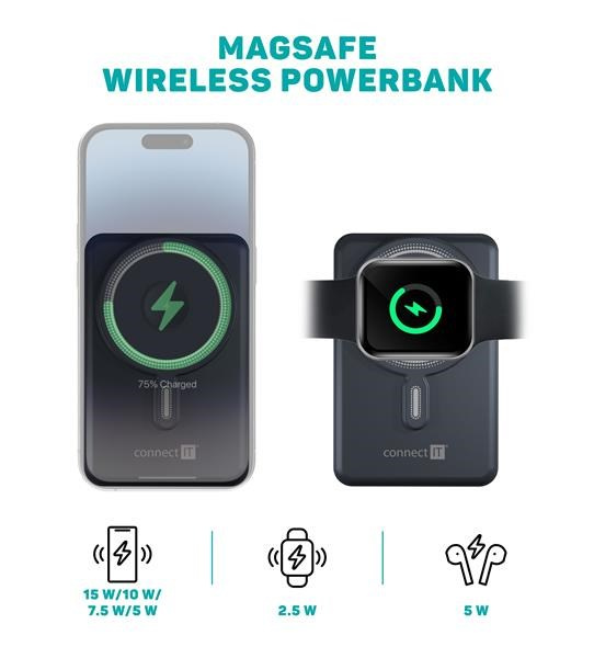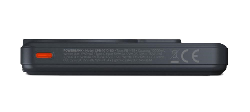 Bezdrátová MagSafe powerbanka s kapacitou 10000 mAh kompatibilní s Apple iPhone a Apple Watch. Disponuje integrovaným USB-C a Lightning kabelem. Podporuje až 20 W rychlonabíjení pomocí USB-C kabelu.