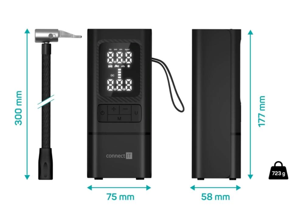 Kompresor disponuje velkým LED displejem, který zobrazuje stav nabití baterie, výběr přednastaveného režimu, výši tlaku a aktuální hodnotu tlaku. K dispozici je pět přednastavených režimů s výchozím rozsahem tlaku vzduchu pro jednotlivé použití (auto/motorka/kolo/míč/manuál). V manuálním režimu si můžete zvolit hodnotu, kterou si kompresor bude pamatovat pro příští použití. Díky vestavěné Li-Ion baterii s kapacitou 6 000 mAh, budete mít jistotu bezproblémového použití kdykoliv a kdekoliv. V případě nouze můžete kompresor využít i jako powerbanku a díky LED světlu si můžete posvítit při zhoršených světelných podmínkách. Kompresor je vyroben z kombinace polykarbonátu a ABS, který je extrémně pevný a tvrdý, odolný vůči vysokým teplotám (115 °C) a nárazu.