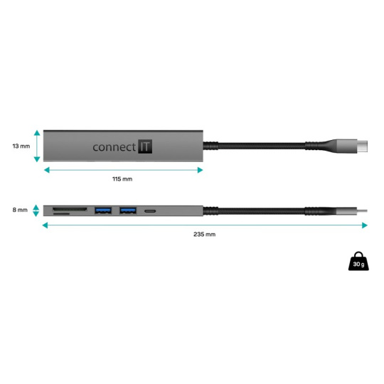 Prakticky tvarovaný USB-C hub pro připojení až 3 USB periferií (1 x USB-C a 2 x USB-A), 1x SD karty a 1x MicroSD karty. Umožní připojení např. myši, klávesnice, MP3 přehrávače, scanneru, tiskárny, digitálního fotoaparátu, externího pevného disku, flashdisku atd.