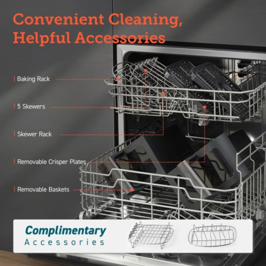 Cosori Dual Basket má také několik bezpečnostních prvků, jako je automatické vypnutí, ochrana proti přehřátí, protiskluzové nožičky a vždy chladné rukojeti. Tyto funkce zajišťují, že použití Cosori Dual Basket je bezpečný pro vás a vaši rodinu.