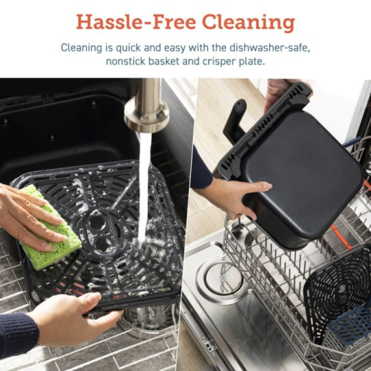 Vyjímatelný fritovací koš a nádoba jsou vyrobeny z odolného, nepřilnavého a zdravotně nezávadného materiálu (BPA a BFOA FREE) a lze je mýt v myčce. Vždy chladná rukojeť a tlačítko pro uvolnění koše eliminují riziko popálení a nechtěného uvolnění.