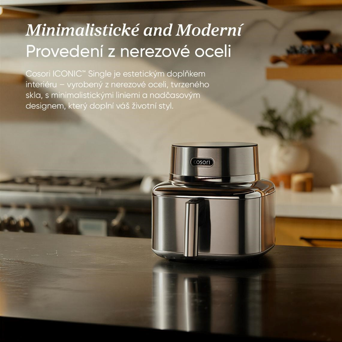 COSORI Iconic byl navržen jako přirozená součást moderního interiéru, ne jako obyčejný spotřebič. Nerezová ocel a tvrzené sklo vytvářejí čistý, klidný vzhled, který krásně zapadne do minimalistických kuchyní. Je to objekt, který potěší oko pokaždé, když kolem něj projdete.