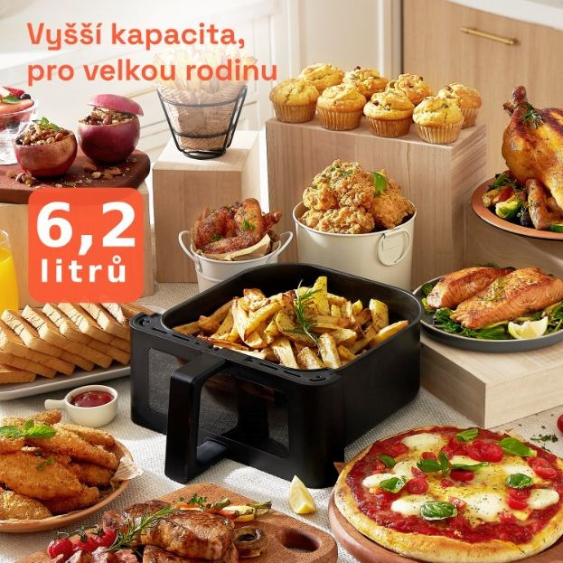 Horkovzdušná fritéza je moderní nástroj pro moderní dobu. Bez problémů nahradí klasickou troubu při výrazně nižší spotřebě elektrické energie, nabídne zdravější přípravu oblíbených pokrmů s minimem oleje a v neposlední řadě také velmi tichý provoz pro nerušenou domácnost. Díky velké kapacitě fritovacího koše není problém uvařit pro čtyřčlennou rodinu nebo připravit perfektní pohoštění na večírek s přáteli.
