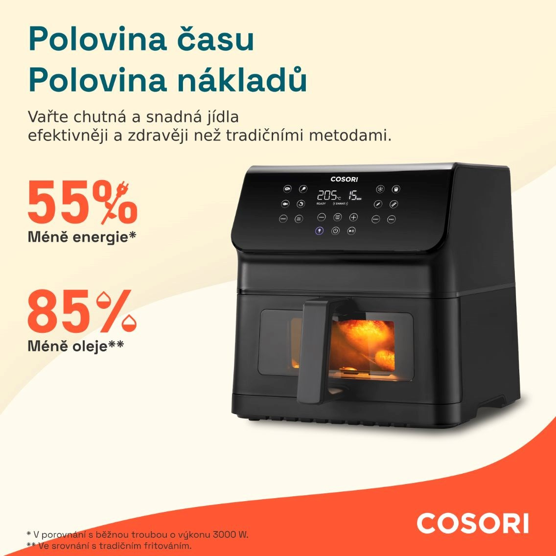 Představujeme horkovzdušnou fritézu Cosori Premium II ve verzi Plus. Inovované řešení, které nejen šetří čas, ale také energii a nabízí způsob vaření, který je šetrný ke zdraví. S horkovzdušnou fritézou si můžete užívat oblíbená jídla připravovaná s minimem oleje, vyhnete se zápachu ze smažení a také úklid je díky možnosti mýt koš v myčce hračkou. Fritéza nabídne koš se štědrým objemem 6,2 litrů, takže v ní je možné pohodlně připravit jídlo pro 3-5 lidí, například celé, 2,3 kg kuře. Verze Plus je vybavena okénkem a osvětlením, takže máte přehled, v jaké fázi se příprava nachází bez nutnosti vysouvání koše a přerušování přípravy. Při vysoké objemu si fritéza zachová malé vnější rozměry, takže se hodí i do malých kuchyní. S technologií 360° cirkulujícího vzduchu se fritéza zahřeje na provozní teplotu do 5 minut a dále výrazně zkracuje dobu vaření. Malý objem také znamená malou spotřebu energie ve srovnání s běžnou troubou. Fritéza nabídne 12 programů pro přípravu pokrmů, které je možné upravit podle individuálních chutí. Displej fritézy je přehledný a pohodlně nakloněný pro perfektní čitelnost. V dnešní digitální době je také poměrně atraktivní funkce vypnutí zvuku tlačítek. Jako bonus k dodávané vícejazyčné kuchařce si můžete stáhnout e-kuchařku s 80 recepty v češtině i slovenštině. V balení navíc najdete 5ks špízových jehel a špízový rošt.