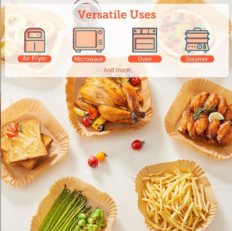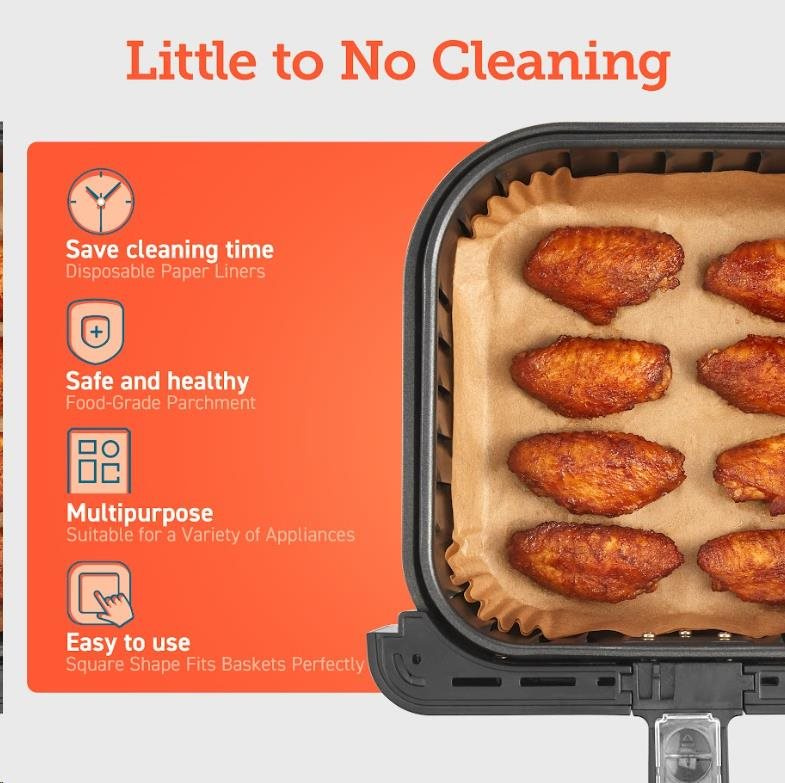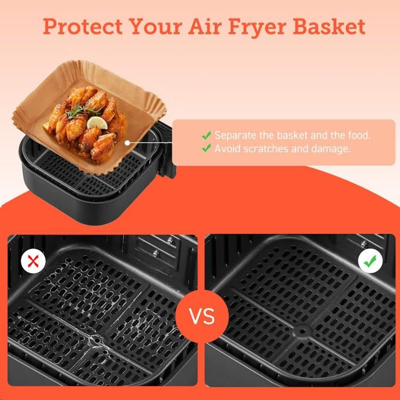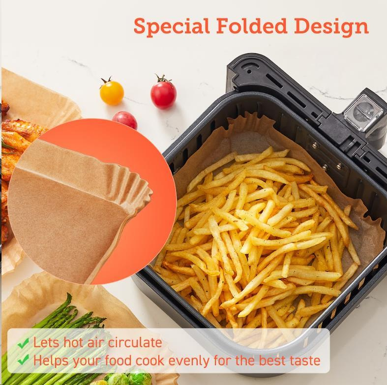 Čtvercové jednorázové pečicí papíry pro horkovzdušnou fritézu jsou koncipovány tak, aby odpovídaly tvaru koše fritézy, takže je nemusíte trhat ani stříhat. Když jste připraveni k vaření, jednoduše je vložte do koše.
