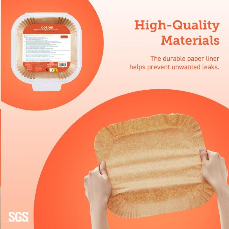 Pečicí papíry COSORI jsou vyrobeny z netoxického a neběleného materiálu v potravinářské kvalitě bez vosku a lze je ohřívat až na 230 °C, nejvyšší teplotu v horkovzdušné fritéze.