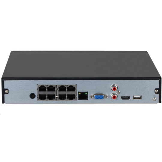 - Rozhraní (porty): 1× RJ-45 LAN (10/100/1000 Mbps), 8× RJ-45 (10/100 Mbps, PoE, IEEE 802.3af/at), 2× USB 2.0, 1× audio vstup (RCA), 1× audio výstup (RCA), 1× HDMI, 1× VGA výstup