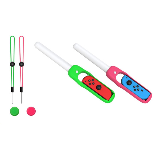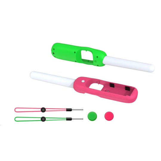 Dance ‘N’ Play Kit obsahuje 2x svíticí tyčinky LED citlivé na zvuk, s růžovým a zeleným úchytem a zápěstními řemínky. Svíticí tyčinky LED citlivé na zvuk s vícebarevným efektem duhového podsvícení budou fungovat, pulzovat, zářit a tančit podle jakéhokoliv zvuku. Ať už půjde o hudbu, nebo zvuky ze hry, Dance ‘N’ Play Kit prozáří váš pokoj.