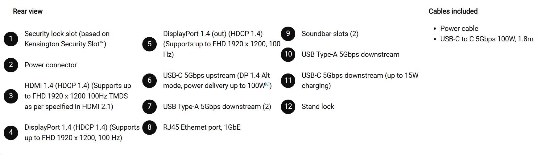 • 1 USB-C 5Gbps upstream port/s (DisplayPort 1.4 Alt Mode, Power Delivery up to 100 W)