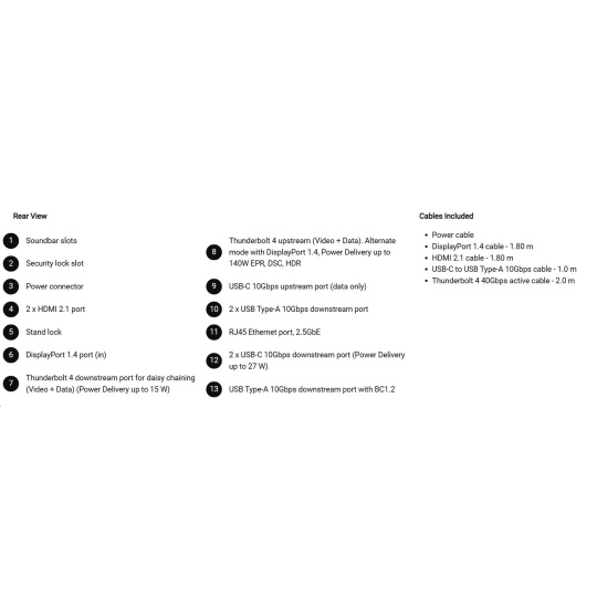 • 1 Thunderbolt 4 40Gbps downstream port/s for daisy chaining (Power Delivery up to 15 W)