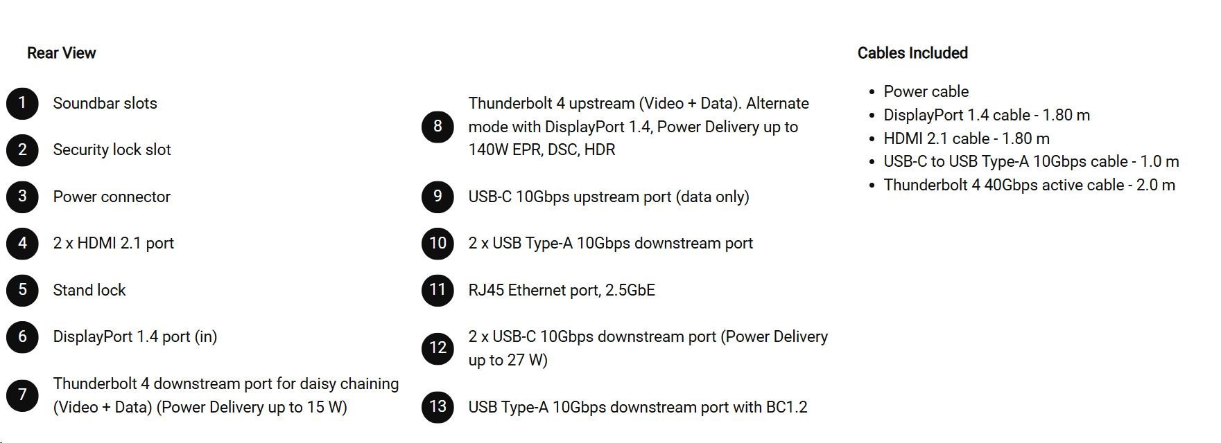 • 1 Thunderbolt 4 40Gbps downstream port/s for daisy chaining (Power Delivery up to 15 W)
