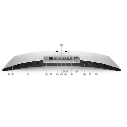 | 1. Security lock slot (based on Kensington Security Slot™) 2. Power connector 3. 2x HDMI 2.1 4. DisplayPort 1.4 5. USB Type-C upstream port (video and data). (Alternate mode with DisplayPort 1.4, Power Delivery up to 90W) 6. Audio line-out port 7. USB Type-C upstream port (data only, 10 Gbps, USB 3.2 Gen 2) 8. 4x USB Type-A downstream ports (SuperSpeed USB 10 Gbps, USB 3.2 Gen 2) 9. RJ45 connector 10. Stand lock 11. USB Type-A downstream port (SuperSpeed USB 10 Gbps, USB 3.2 Gen 2) with BC1.2 charging capability at 2A (max) 12. 2x USB-C downstream ports (SuperSpeed USB 10 Gbps, USB 3.2 Gen 2) with charging capability at 15W (max) 13. Speakers 14. Power On/Off button 15. Joystick |