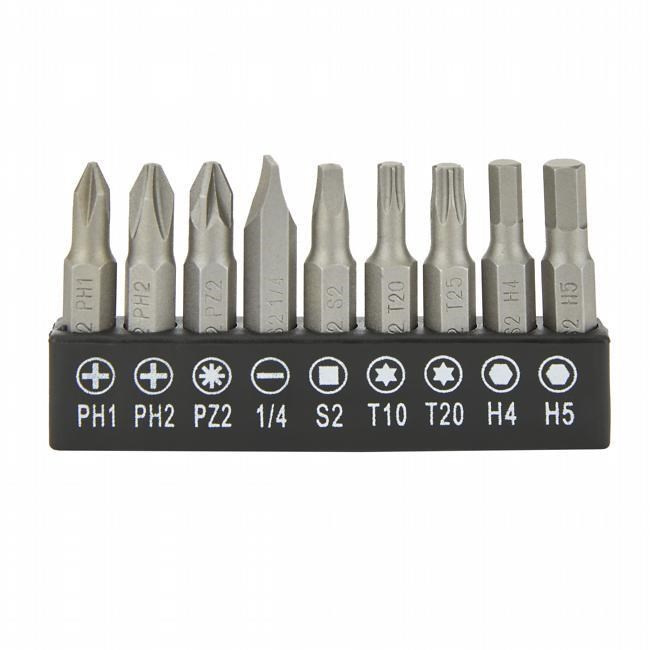 Bity pro každý projekt: 9 šroubovacích bitů a 1 vrták na různé materiály.